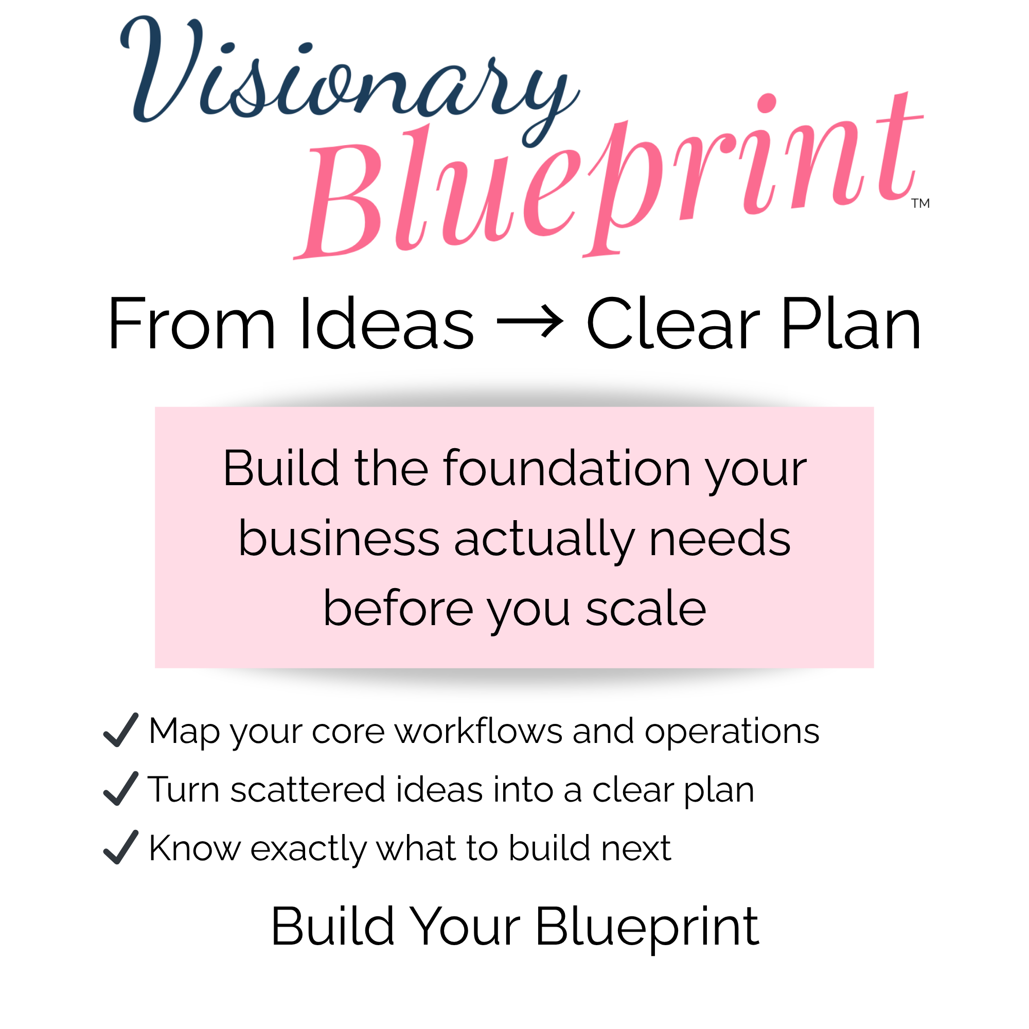 A: Visionary Clarity is a 4-week reset focused on understanding where your business stands right now. Visionary Blueprint takes that clarity and builds on it — giving you 12 full weeks to construct the operational foundation your business needs to grow. Think of Clarity as the audit and Blueprint as the construction.
